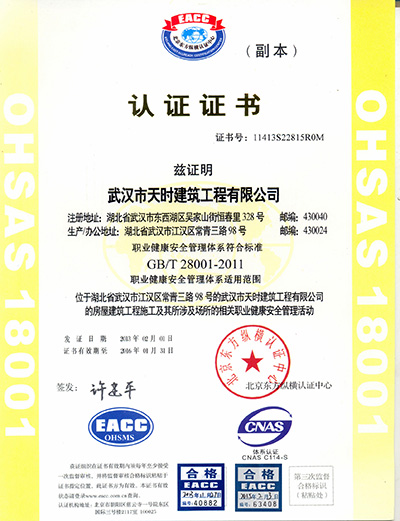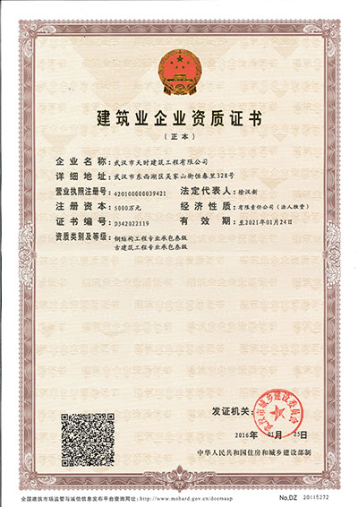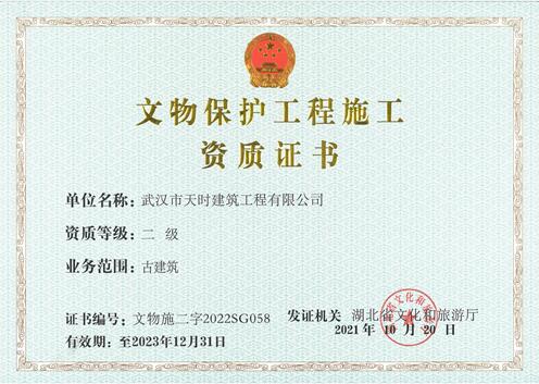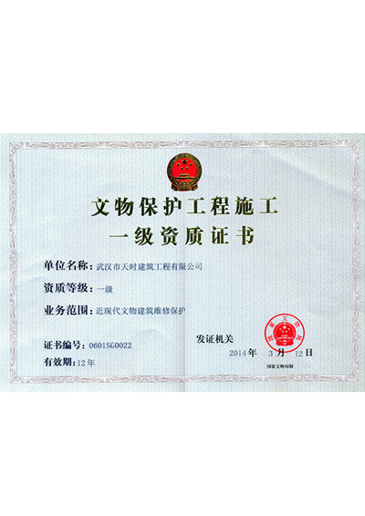 公司先后通過了質量管理體系、環(huán)境管理體系、職業(yè)健康安全管理體系一體化管理體系認證,具有建筑工程施工總承包壹級、文物保護工程近現(xiàn)代修繕施工壹級、文物保護工程古建筑施工二級、建筑裝修裝飾工程專業(yè)承包貳級、鋼結構工程專業(yè)承包叁級、古建筑工程專業(yè)承包叁級資質。