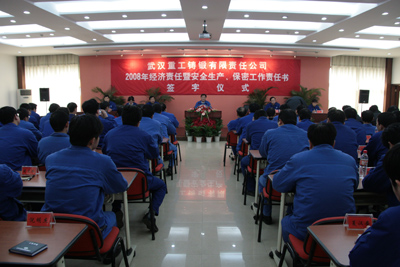 2008年元月7日下午,武漢重工鑄鍛有限責任公司在科技大樓6樓會議室隆重舉行2008年公司經(jīng)濟責任書暨安全生產(chǎn)責任書和保密工作責任書簽字儀式,全體中級以上管理人員參加了簽字儀式。
